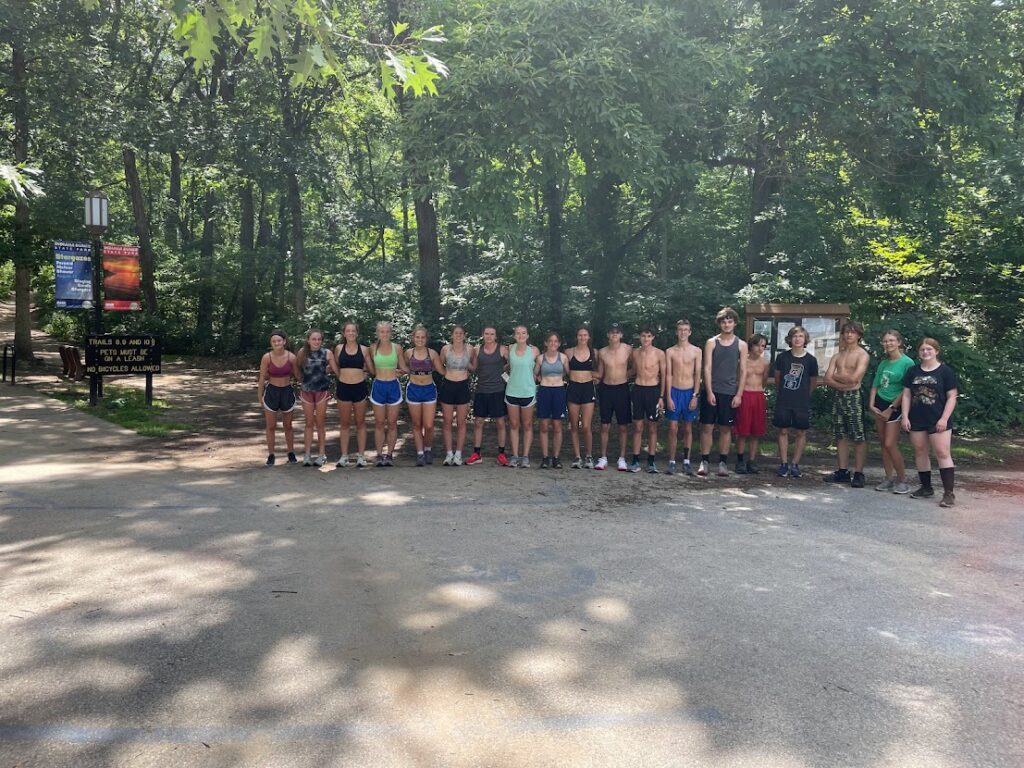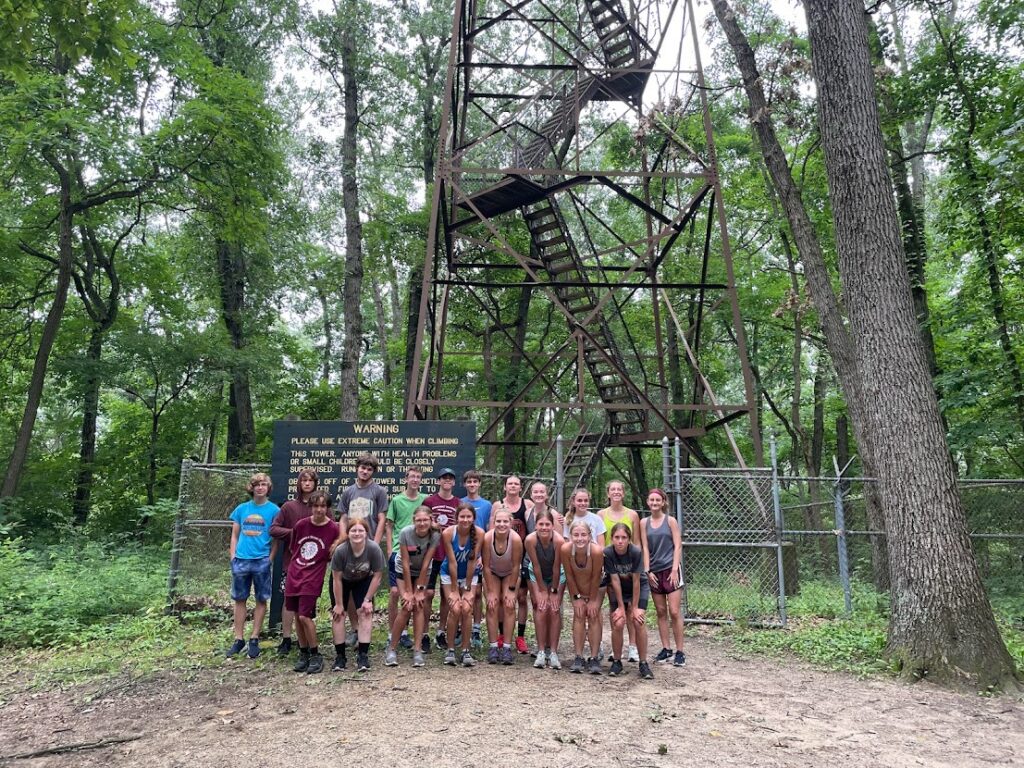 Day 3: Morning shake out and off to the fire tower. We had a talk about doing challenging things and becoming comfortable with the uncomfortable. They accomplished this during their stay! The firetower workout was what is called a Wildman relay. The kids were strategically paired up to balance the teams. Each team of two, runs out to 1 of 4 check points, from the center meeting area, where they will lay down their team markers. They then return to center to tag each other to then retrieve the markers they left out at the check points. They go out and back until each have covered all checkpoints. The firetower sits on top of a hill, as you may remember. All trails leading up are routes to checkpoints with one of the check points being on top of the firetower! The kids had fun with this one. We concluded our workouts with what we told the kids would be the “shortest run of camp”. It was technically. We went to bass lake in a very shallow section of the lake in about waist deep water and did a 1 mile aqua jog.